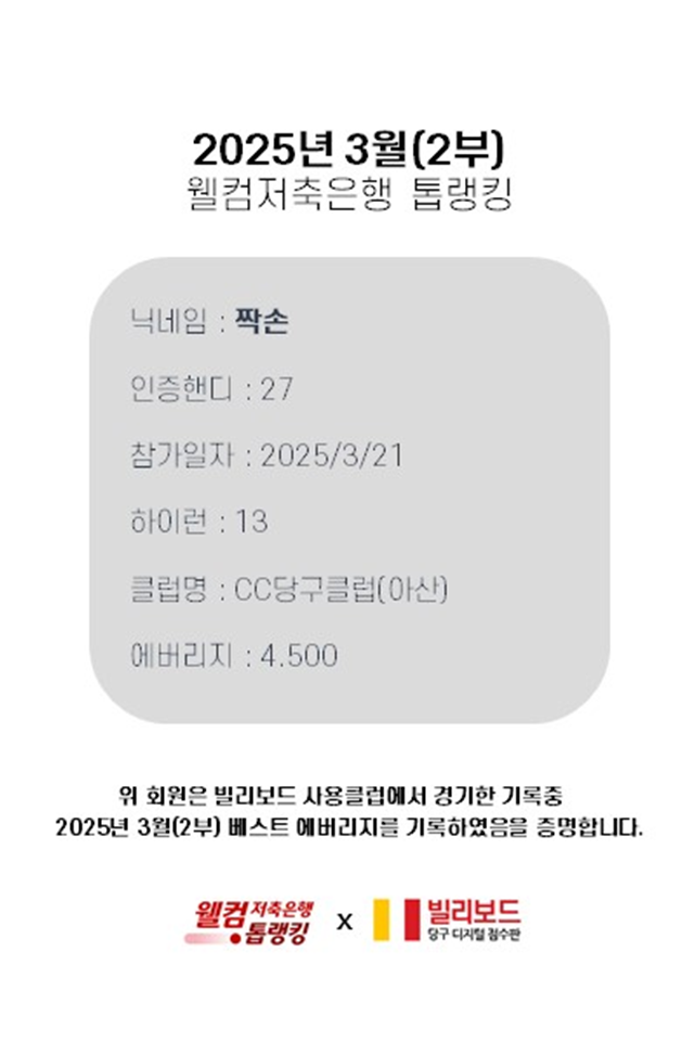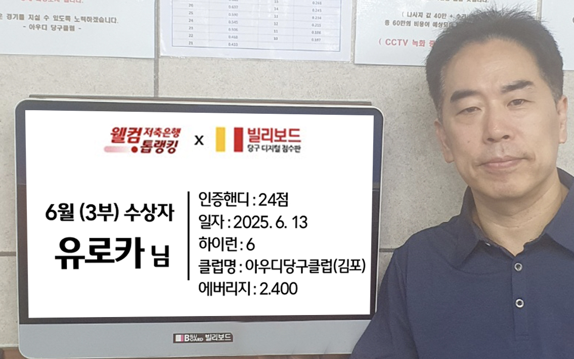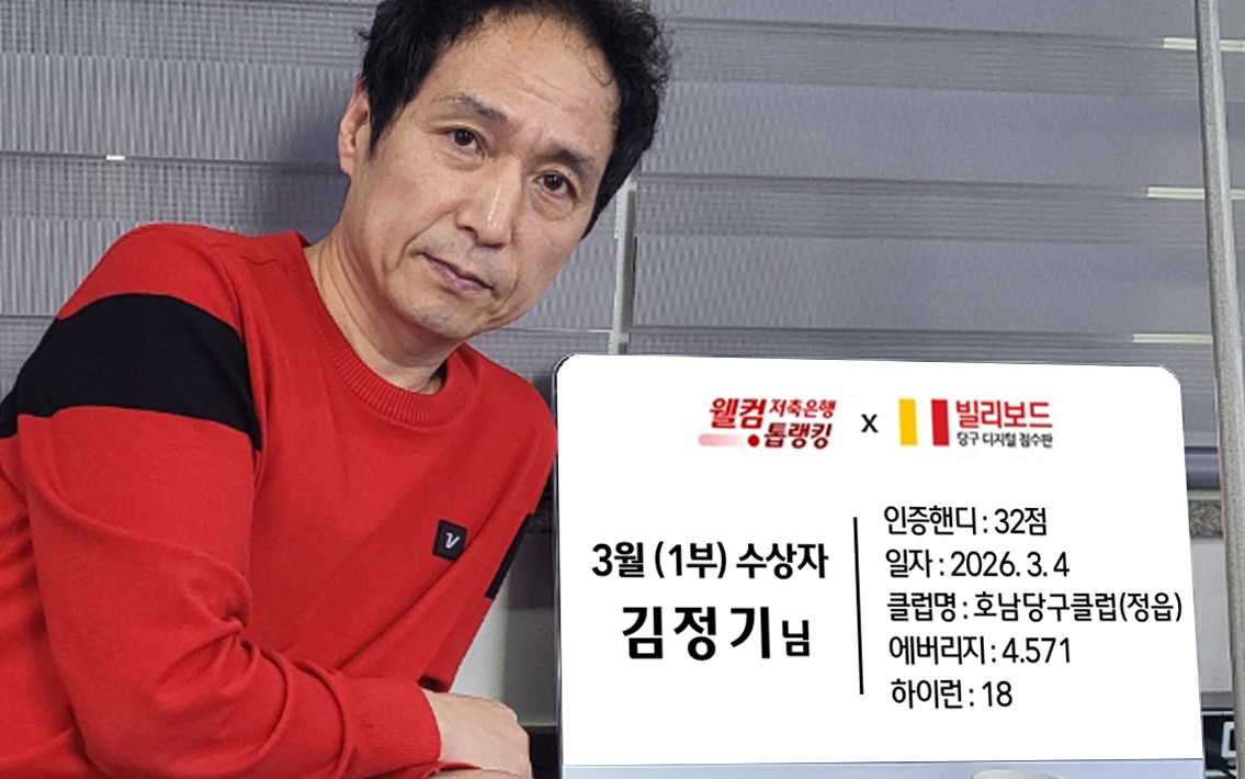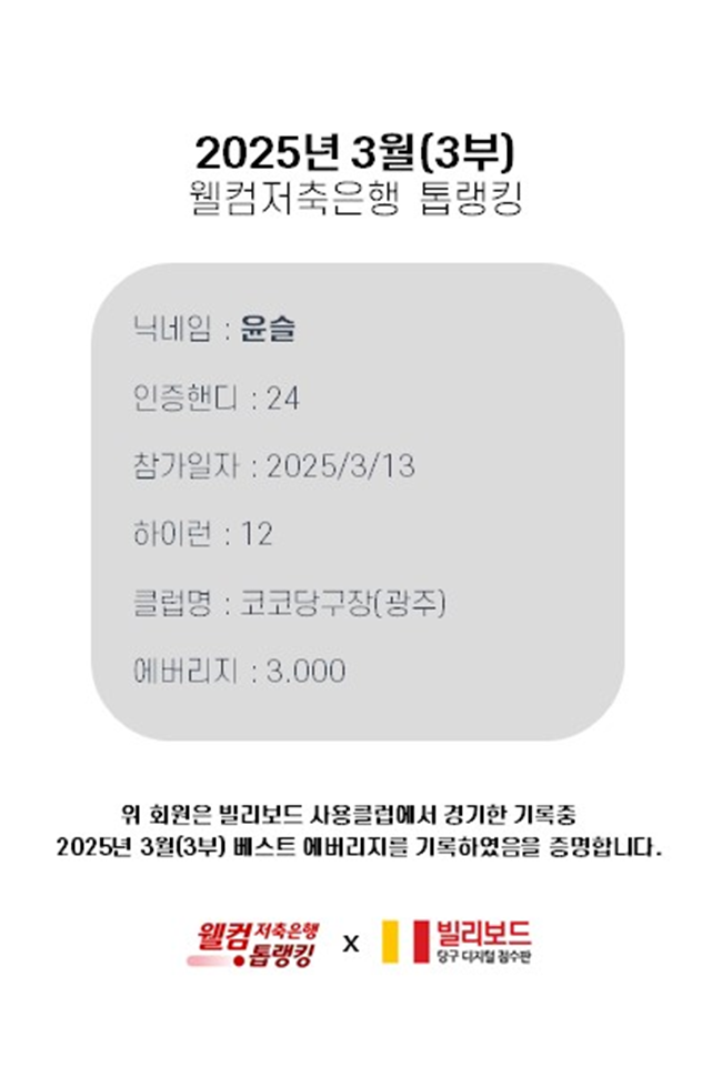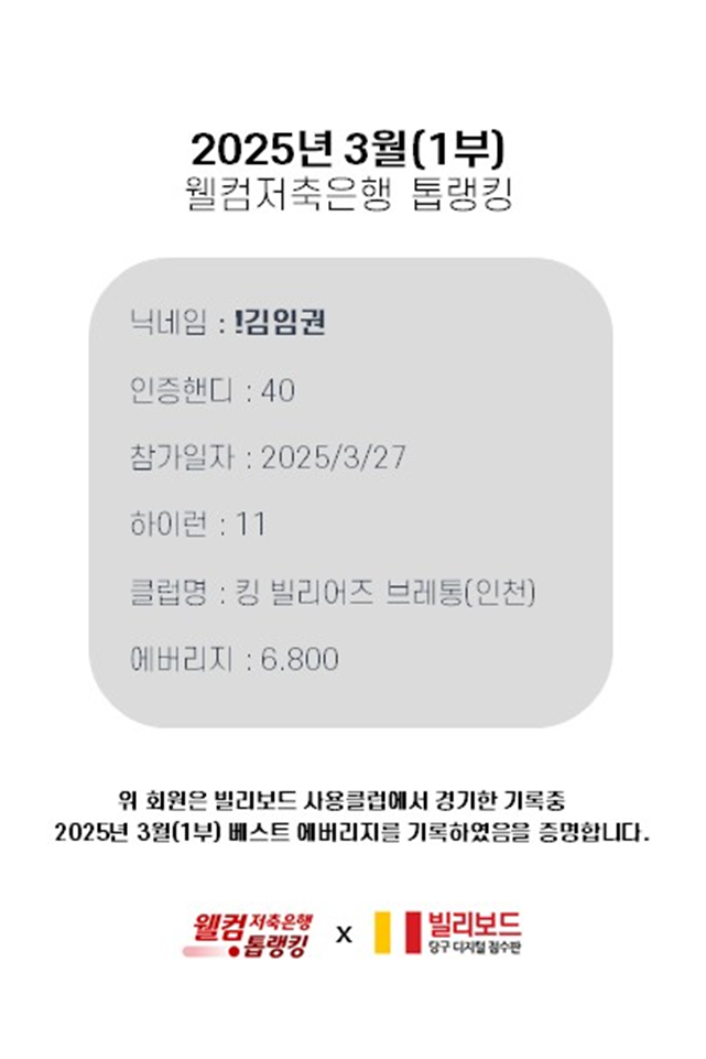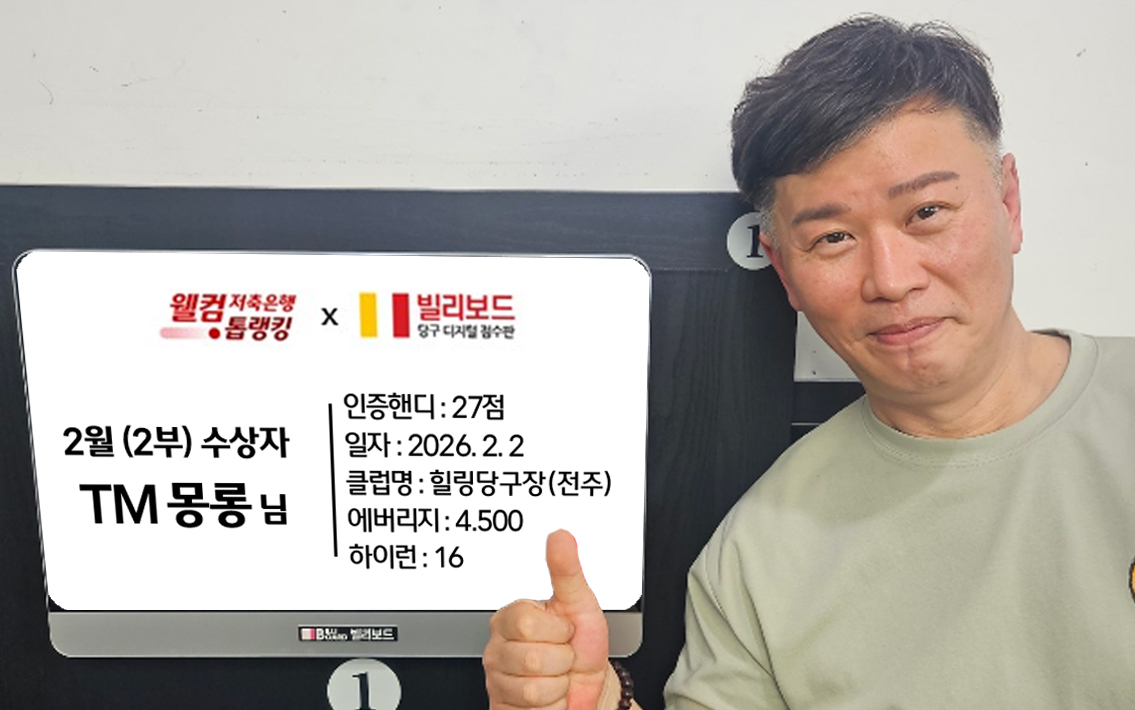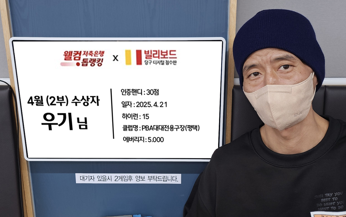 당구동호인 웰컴톱랭킹은 매월 진행되며 빌리보드 클럽에서 경기한 기록 중